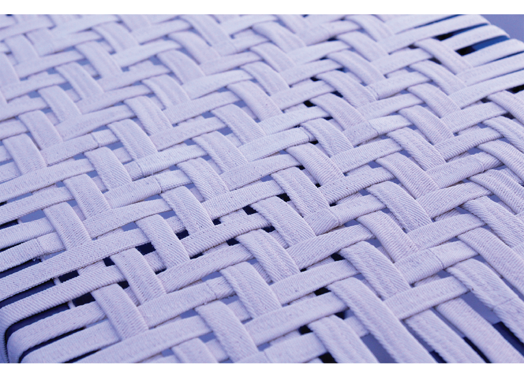 Pattern 1: Thin sewed stripes made of raw cotton scraps to form a traditional basketry woven pattern for a bench upholstery.